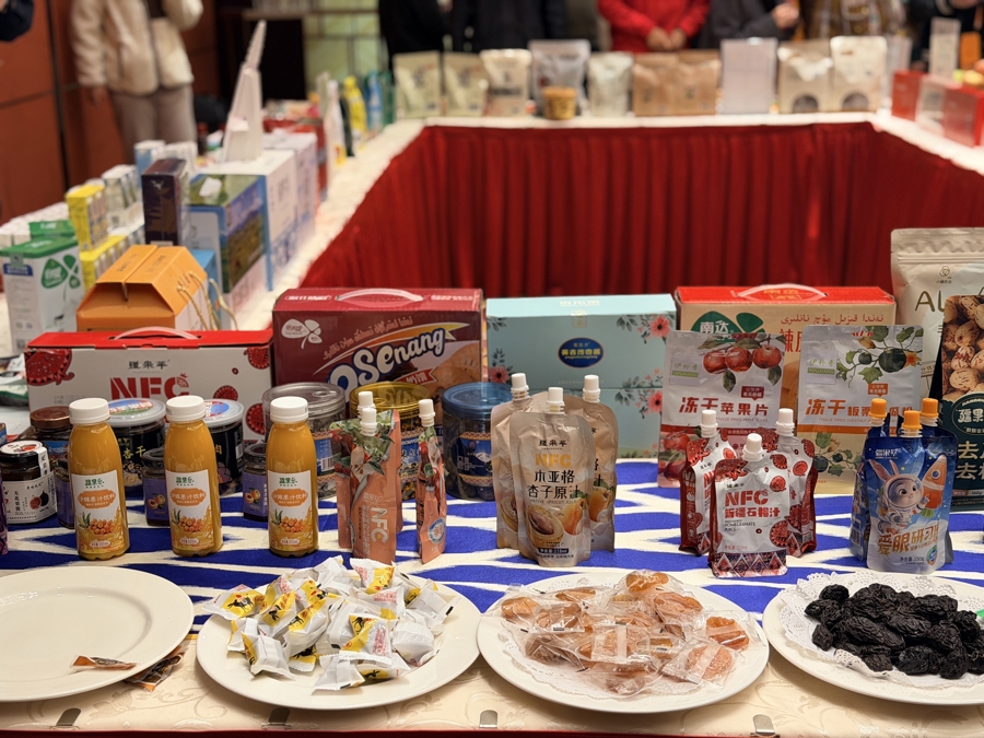 “喀什红”水果番茄、薄皮核桃、枸杞原浆、红枣醋、罗布麻绿茶、绿宝石葡萄干、桑葚干、乳制品、核桃油……发布会现场,不少新疆特色农产品已率先亮相。