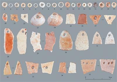 r“冢上出土的器物多为祭祀、陪葬性质遗存,极少生活用器,质地主要为陶、玉、石、骨、蚌等。此外,冢内还出土了大量用蚌、珍珠、螺等制成的饰品,多数为穿孔佩戴,也有与天河石搭配镶嵌使用的。”龚湛清说。